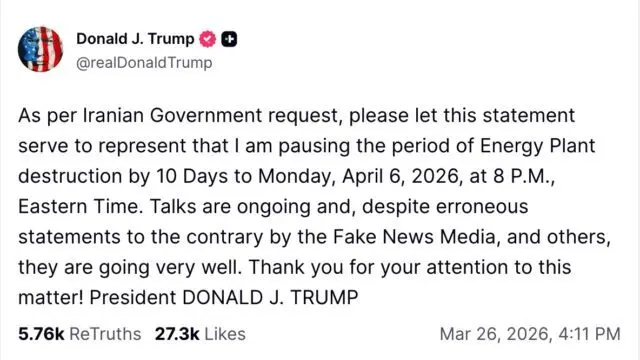 “As per Iranian Government request, please let this statement serve to represent that I am pausing the period of Energy Plant destruction by 10 Days,” Trump wrote on Truth Social. “Talks are ongoing… and they are going very well.”